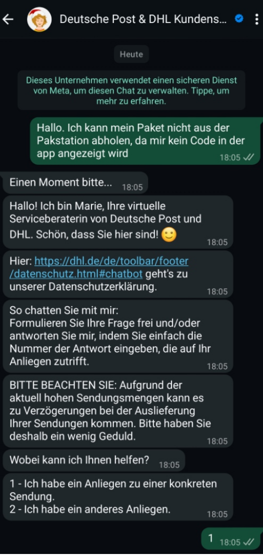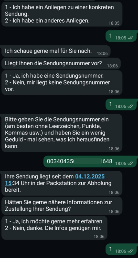 Der WhatsApp-Support von DHL ist aktuell der schnellste Weg, um an den fehlenden Abholcode zu kommen – oft innerhalb weniger Minuten.