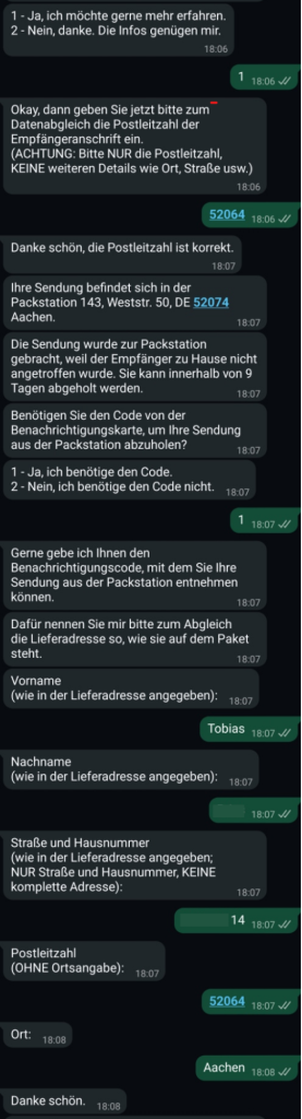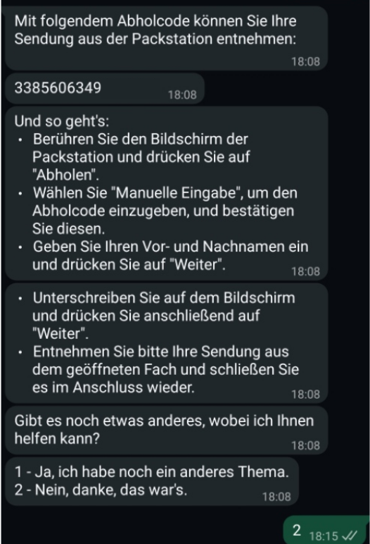 👉 Der DHL WhatsApp Support kann dir nach kurzer Verifizierung den Abholcode mitteilen.
